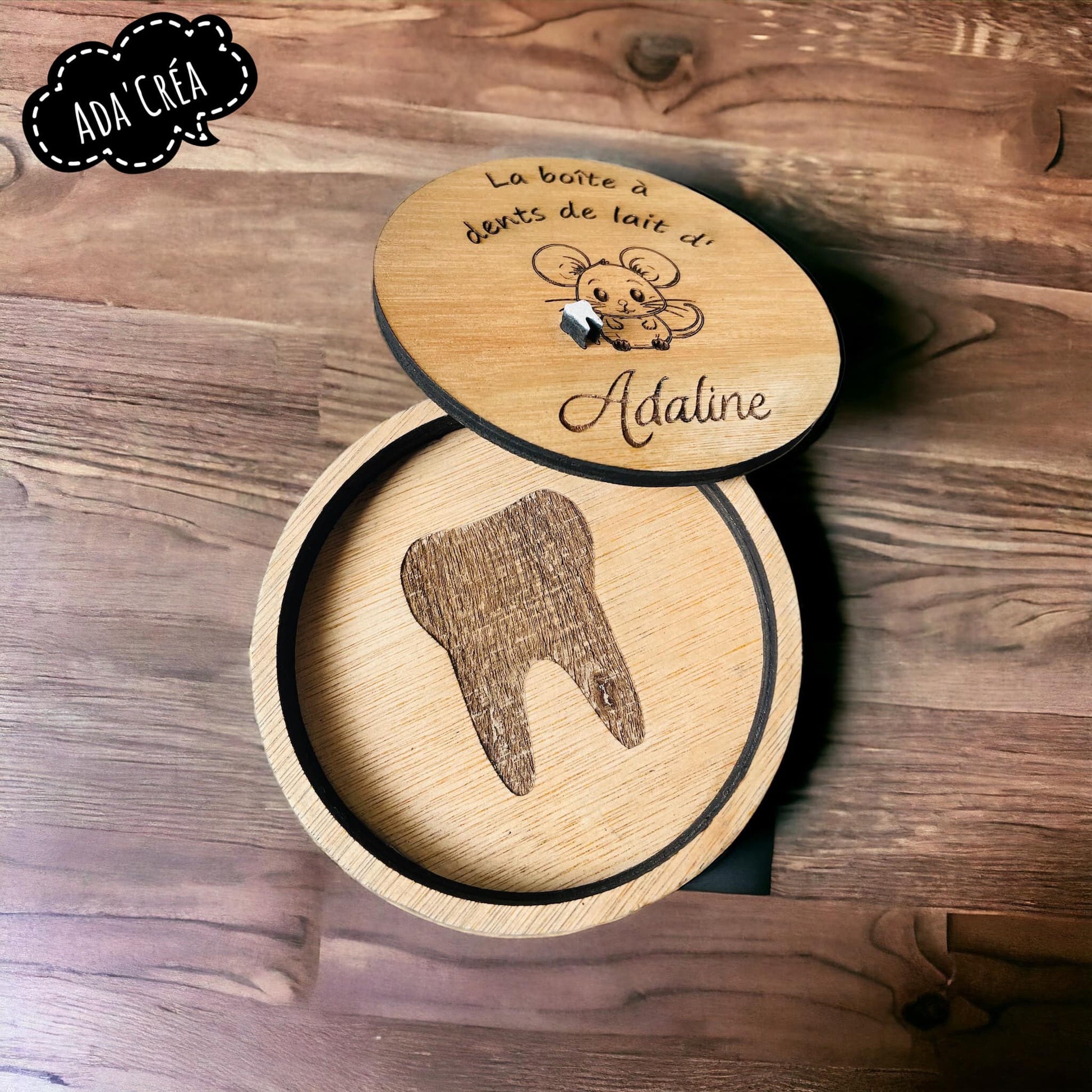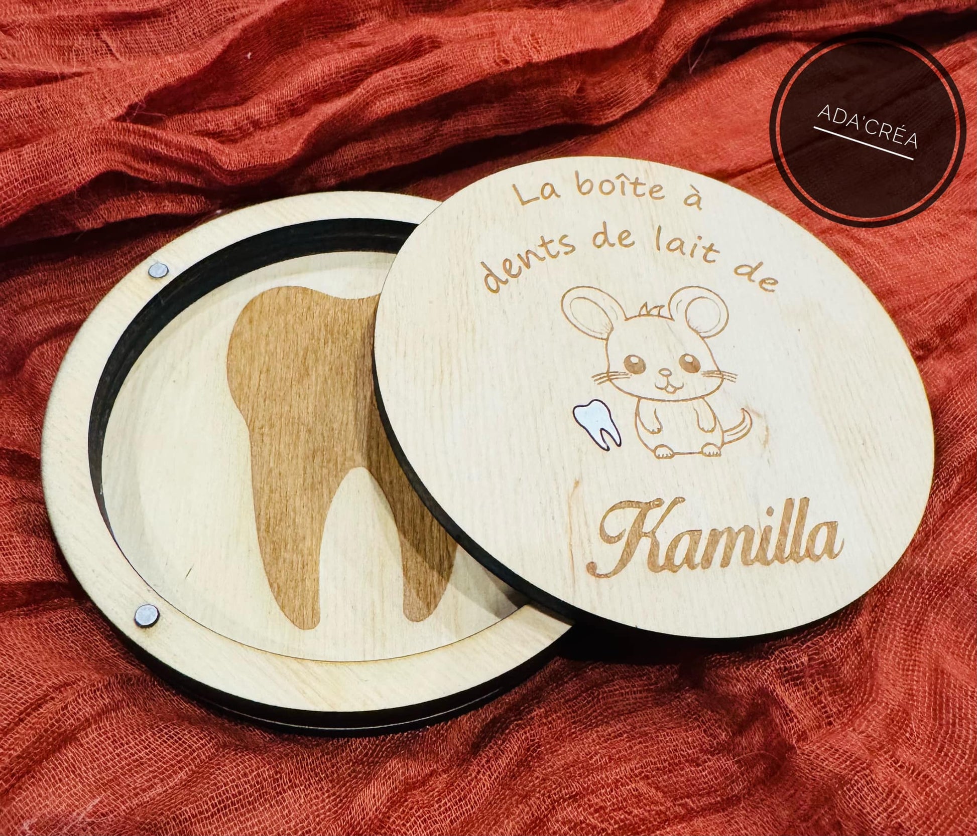 Une boîte à dents en bois personnalisée est un petit récipient conçu pour conserver les dents de lait des enfants. Voici une description détaillée :