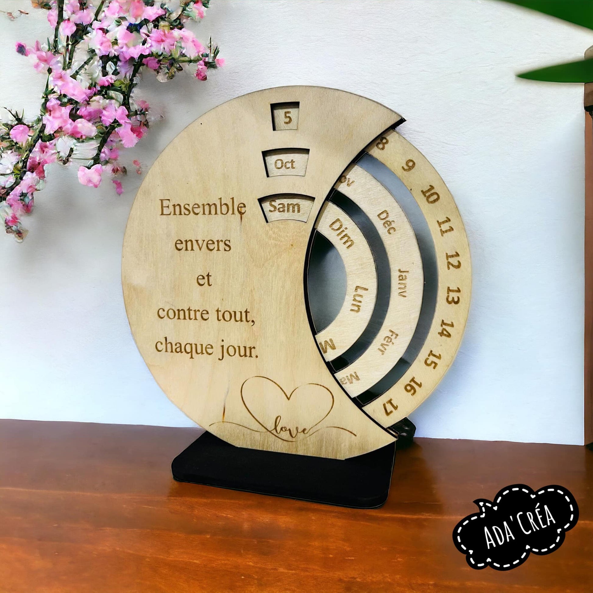 Un calendrier perpétuel personnalisable est un objet de décoration qui n'est pas limité à une année spécifique. Il peut être utilisé indéfiniment car il ne comporte pas de dates précises (comme les jours de la semaine associés aux jours du mois). Vous ajustez manuellement le calendrier pour correspondre au jour et au mois en cours.