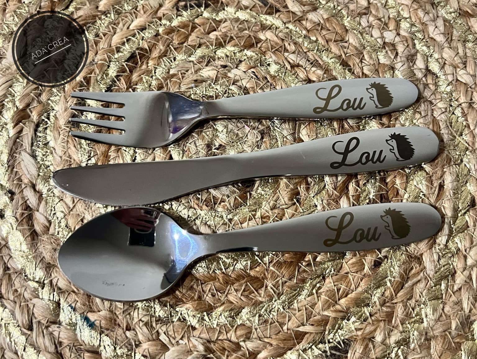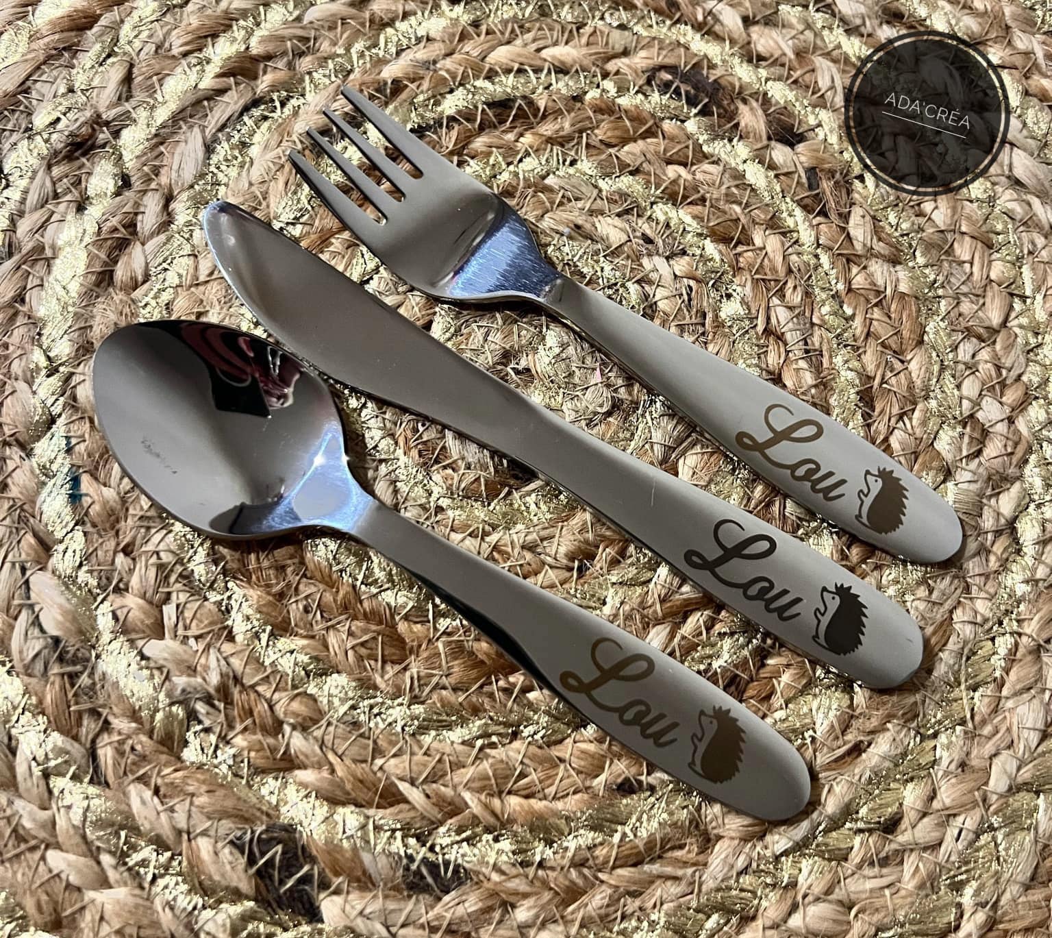 Personnalisation : Les couverts peuvent être gravés avec le prénom de l'enfant, des motifs amusants (animaux, étoiles, voitures, etc.). La gravure est souvent faite au laser pour garantir une bonne durabilité.