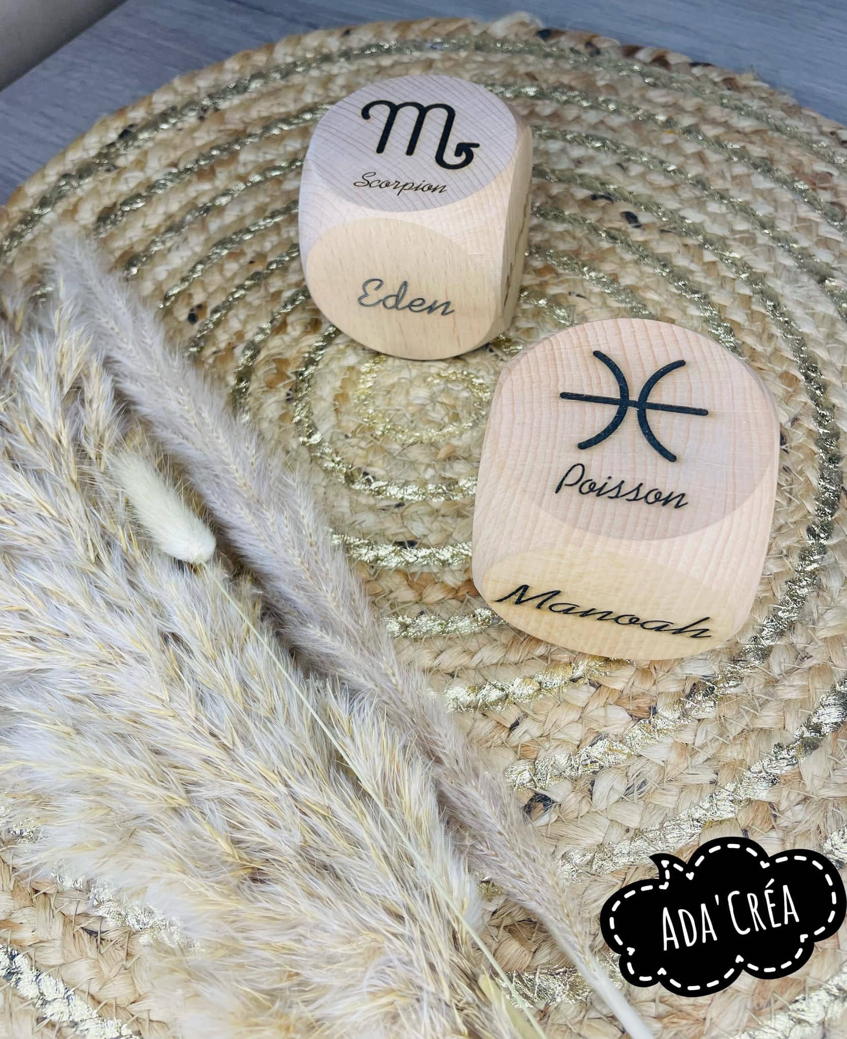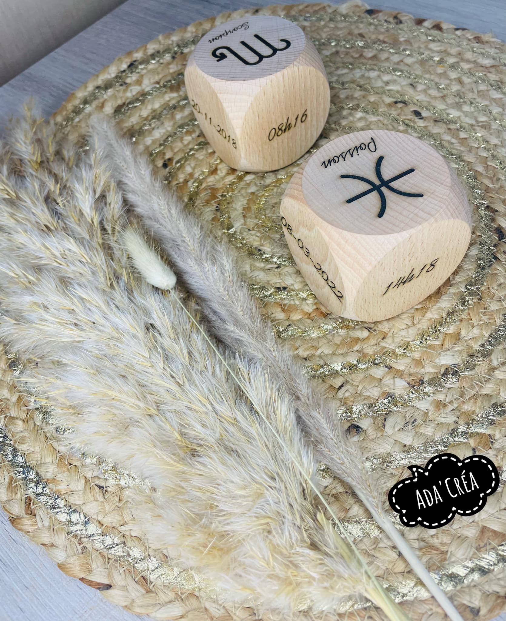 2. Personnalisation : Chaque face du dé peut être personnalisée avec des gravures. Cette personnalisation peut inclure le prénom, la date, l'heure, le poids, la taille et le signe astrologique de votre bébé.