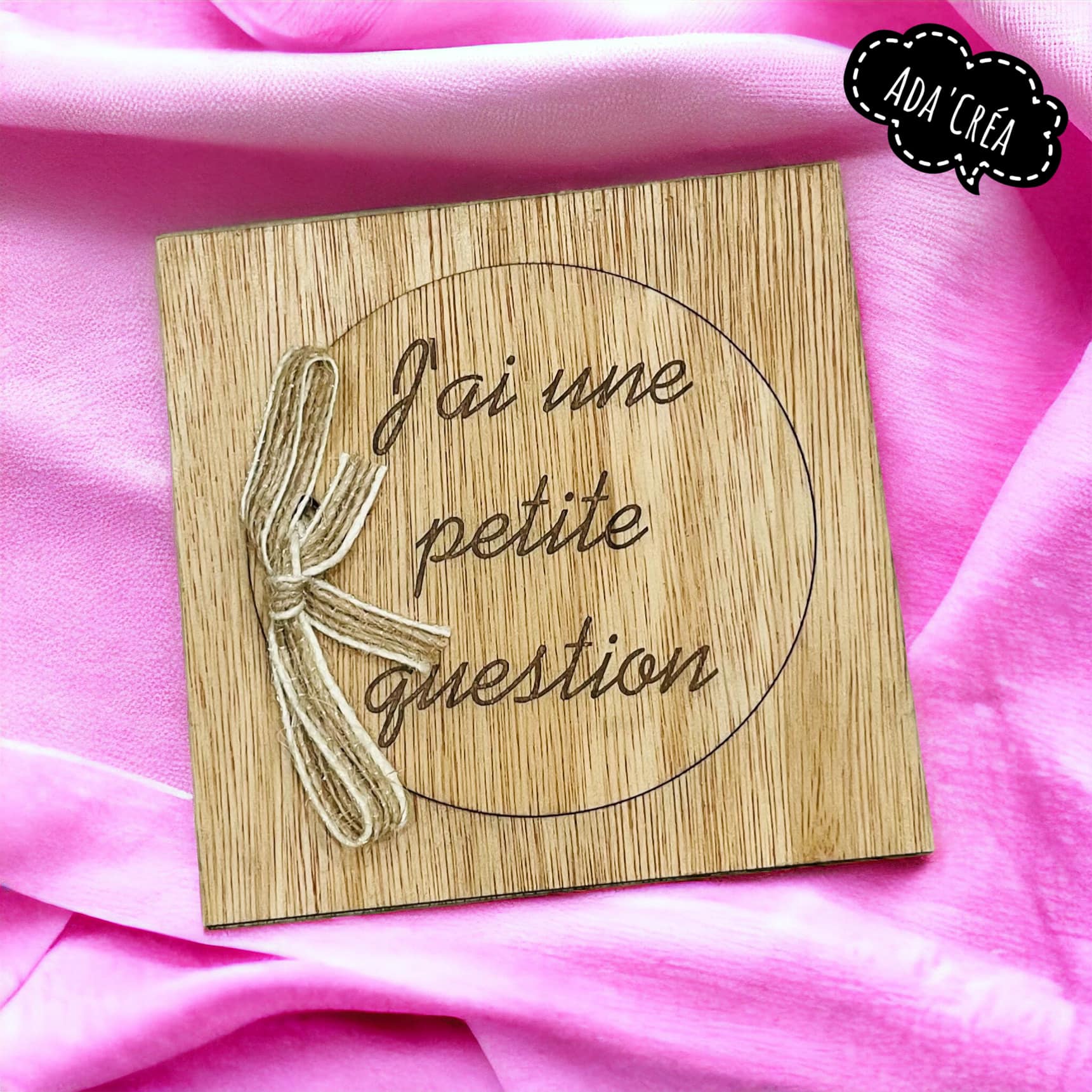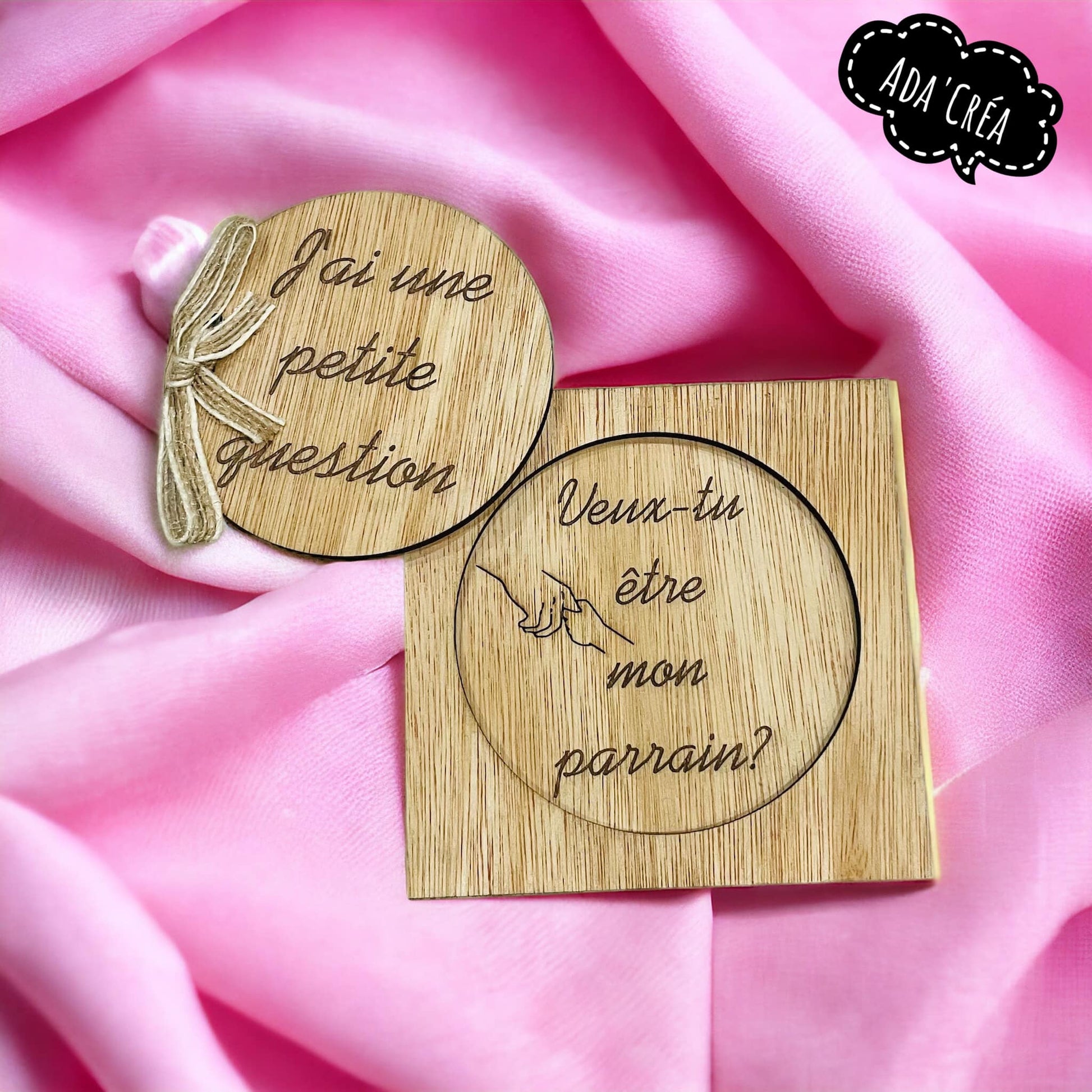Une demande de parrain en bois est une manière originale et touchante d'inviter quelqu'un à devenir le parrain d'un enfant. Ce type de demande se fait généralement sous forme de plaque ou de carte en bois, gravée ou découpée, pour créer un souvenir durable et symbolique.