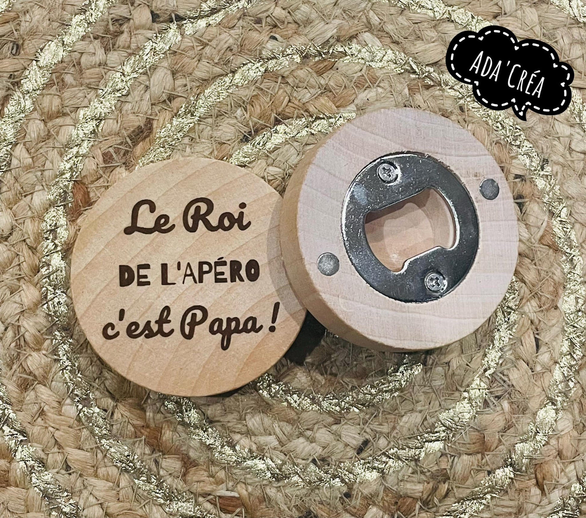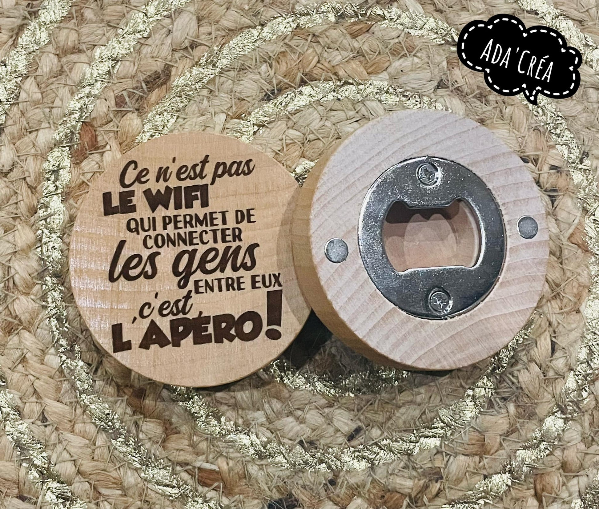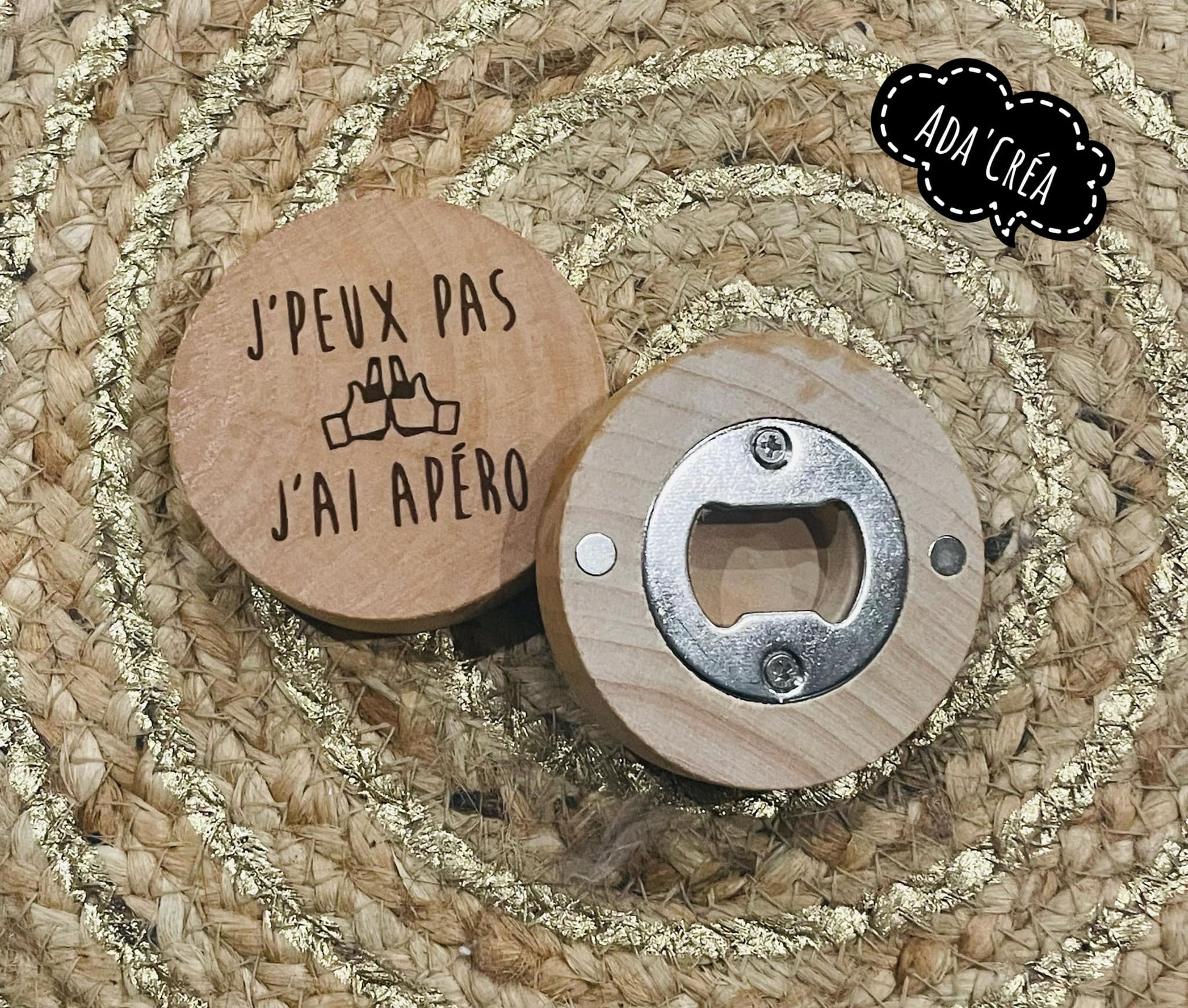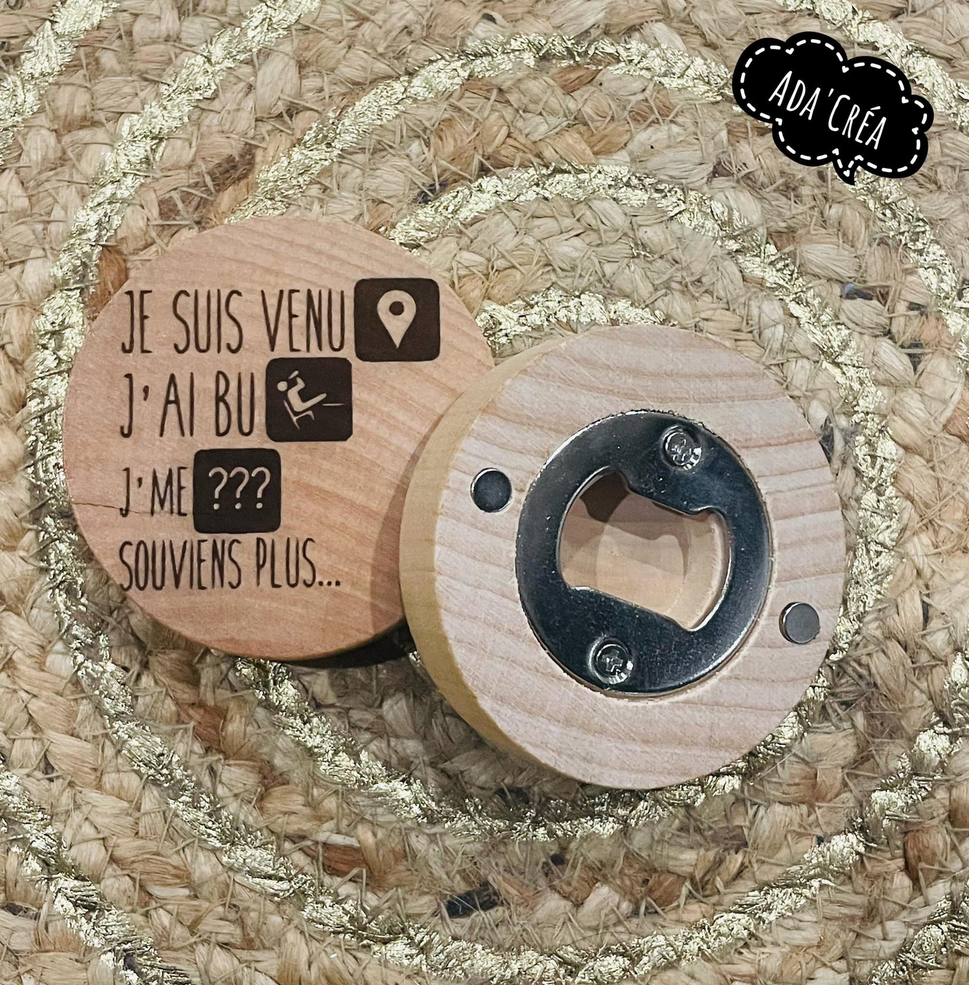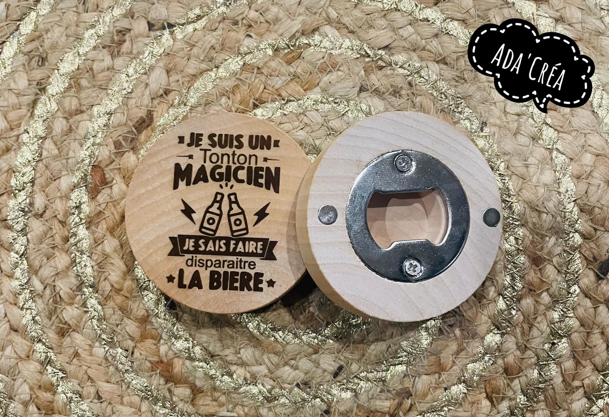 Un ouvre-bouteille en bois magnétique personnalisé est un outil pratique, à la fois fonctionnel et décoratif, souvent conçu pour ouvrir des bouteilles à capsule tout en disposant d'un aimant intégré pour pouvoir l'accrocher sur votre frigo. Voici une description détaillée :